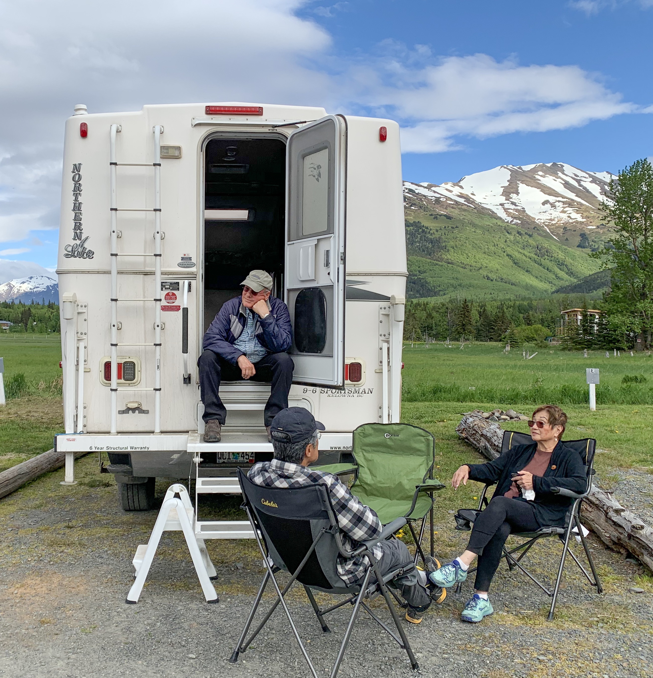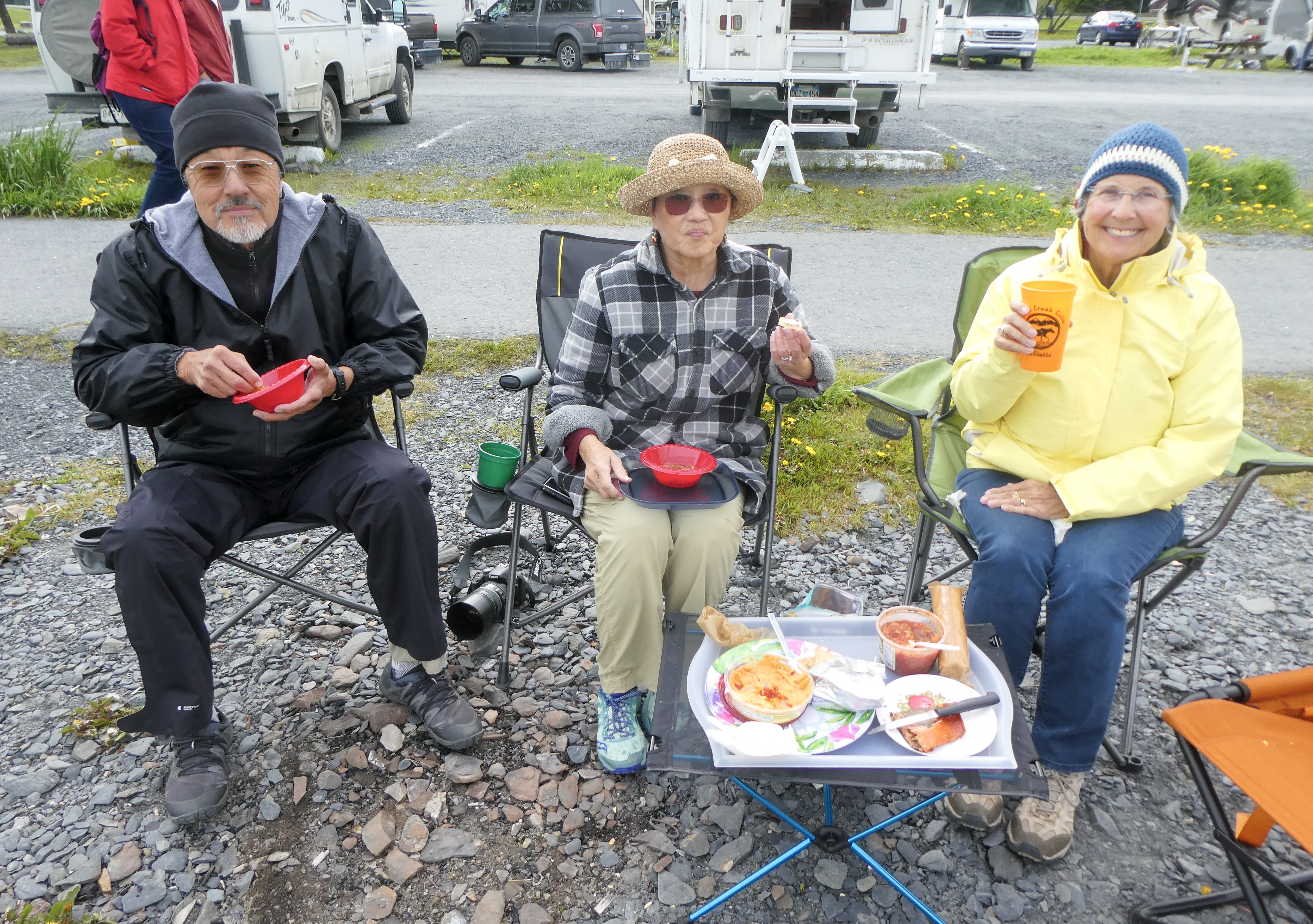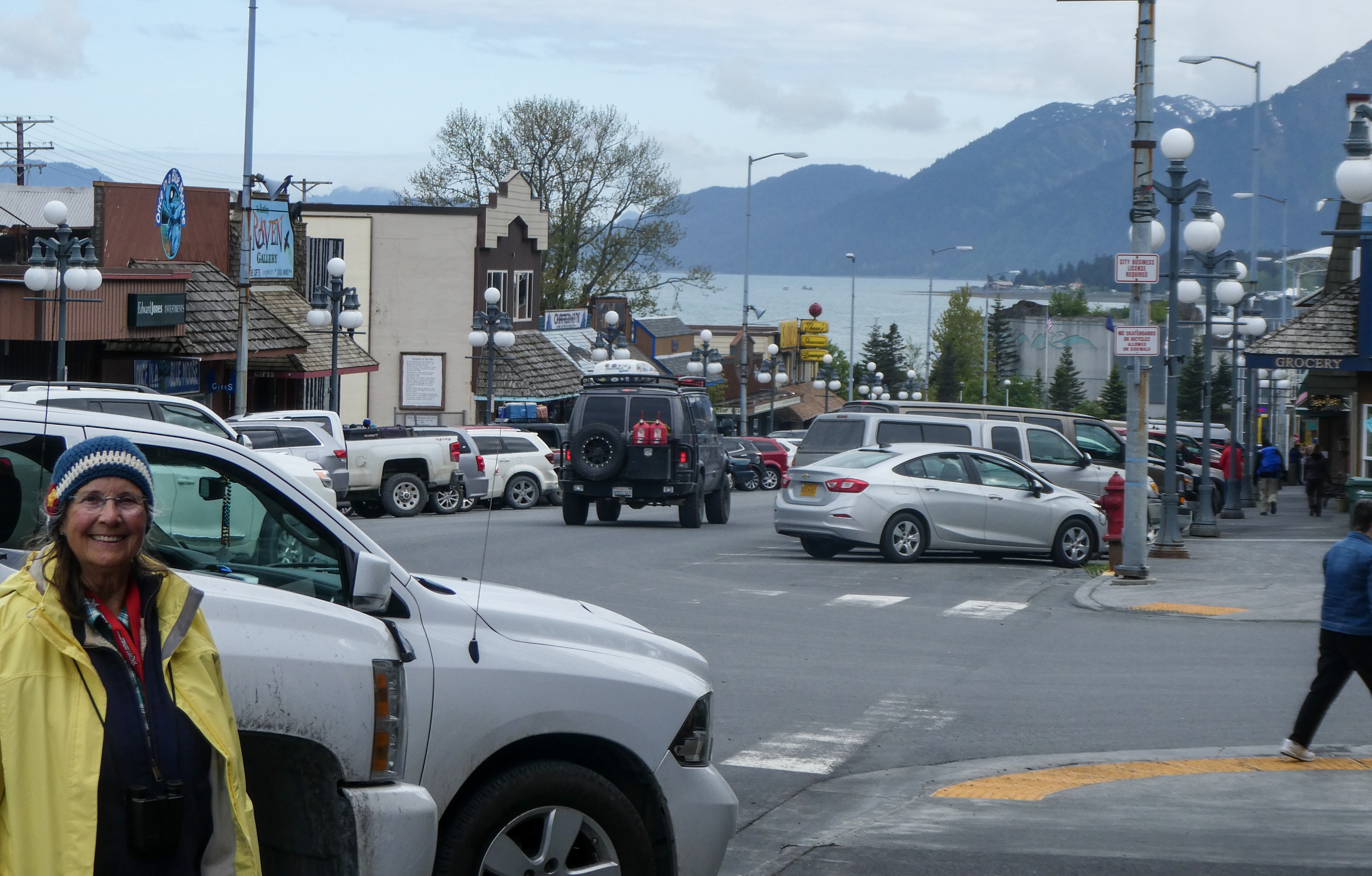 Bears were out roaming all over town. We were told a story that afternoon of a bear climbing into a man’s pickup truck and sitting in the drivers seat eating his lunch scraps. Sally was followed back from the campground toilet by a black bear. Just part of life here, apparently! Read Diana’s sign below.